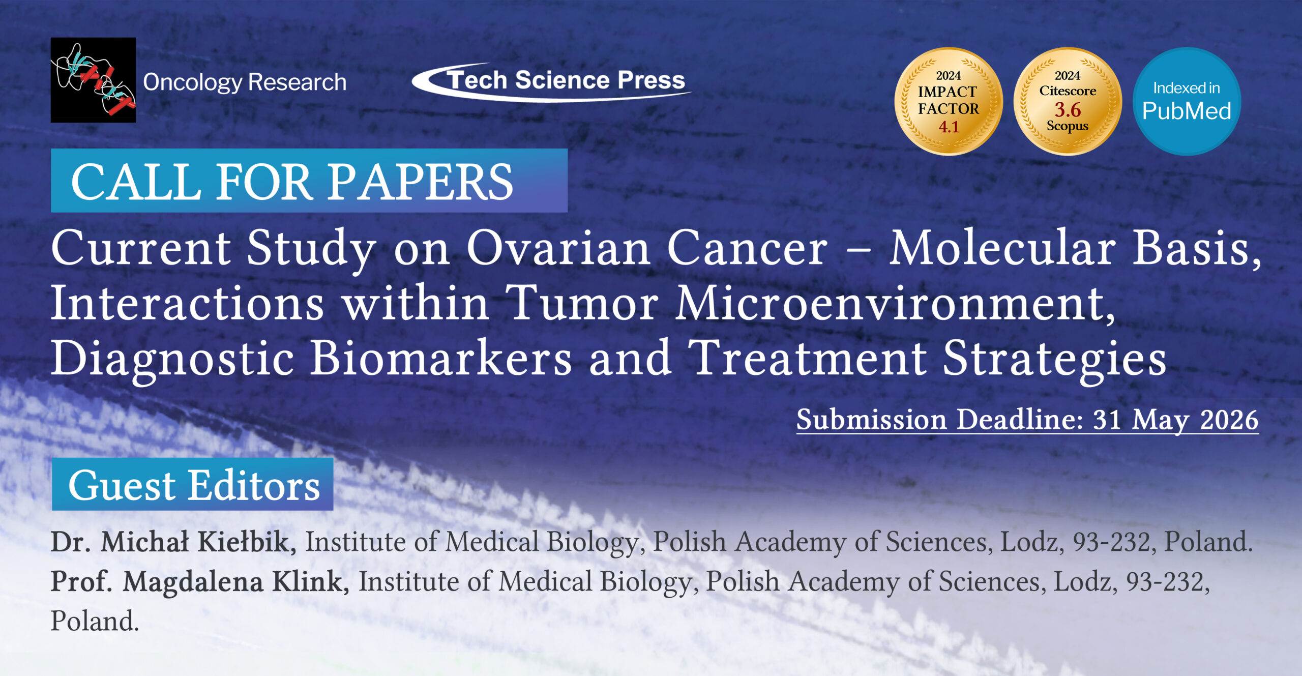 We invite researchers and clinicians to submit their work to the upcoming special issue dedicated to cutting-edge research on ovarian cancer. Topics of interest include, but are not limited to, the molecular mechanisms of tumor progression, treatment resistance, metastasis, the role of the tumor microenvironment, as well as novel diagnostic and therapeutic approaches. The aim is to provide a comprehensive overview of current advancements that may contribute to improved early diagnosis and treatment efficacy.